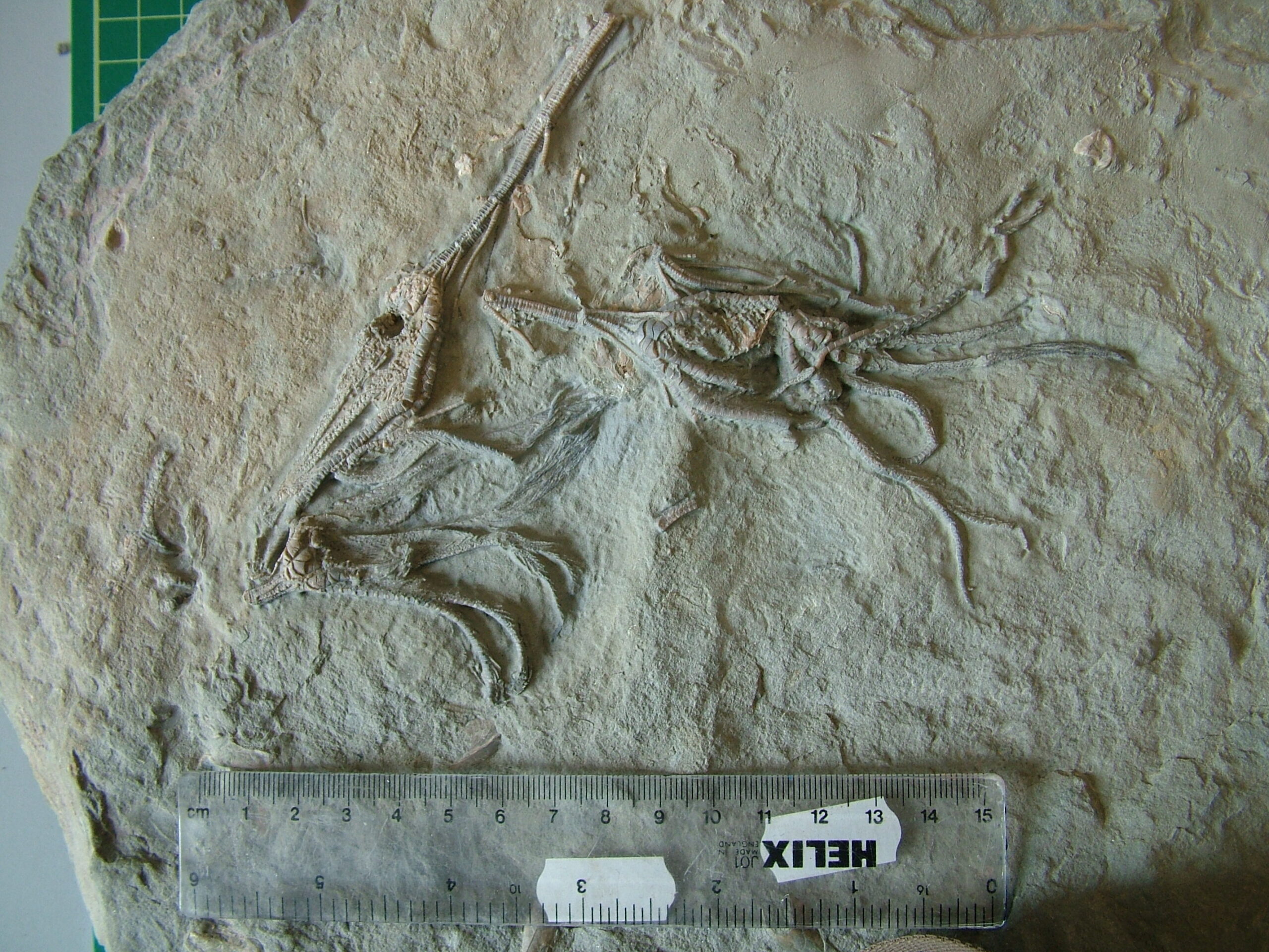 Incomplete but well preserved crinoid exposed on surface of limestone block.