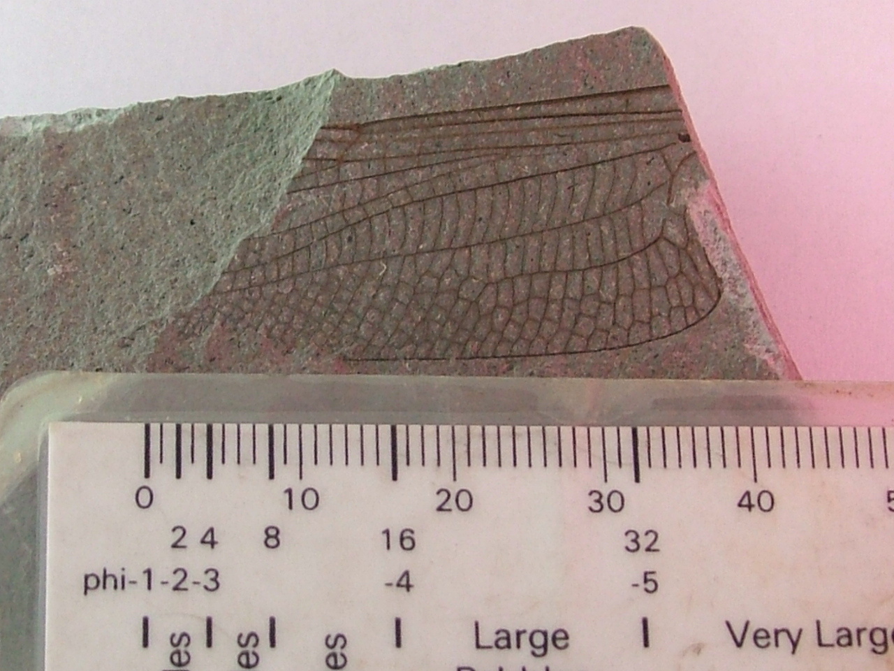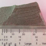 Insect (dragonfly?) wing showing excellent definition and venation. Specimen is in several pieces and needs conserving.