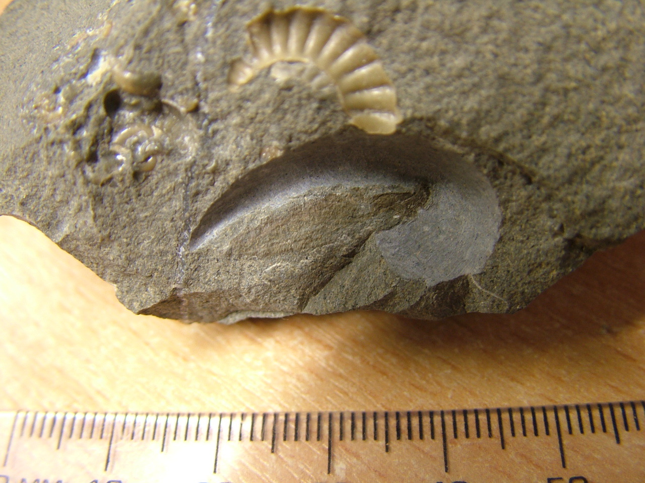 Insect wing in limestone with Promicroceras ammonites