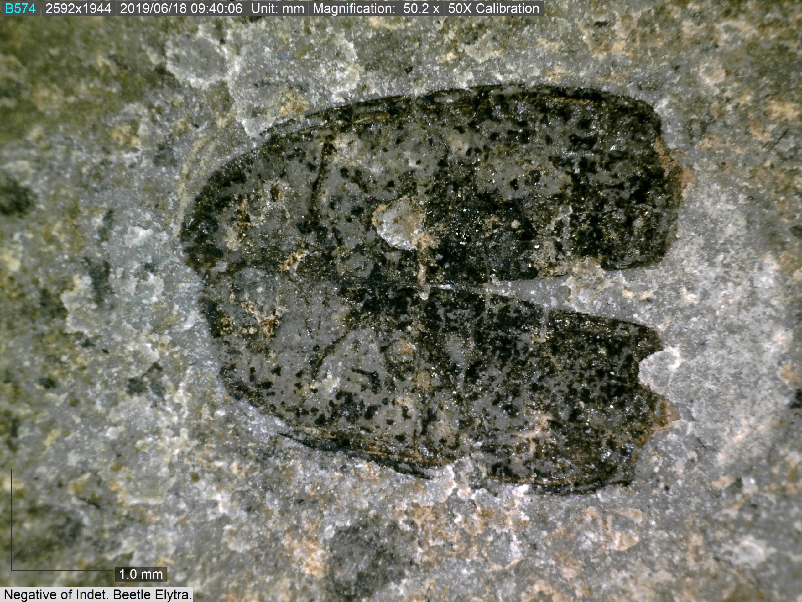 Paired beetle elytra, part and counterpart preserved in a limestone nodule