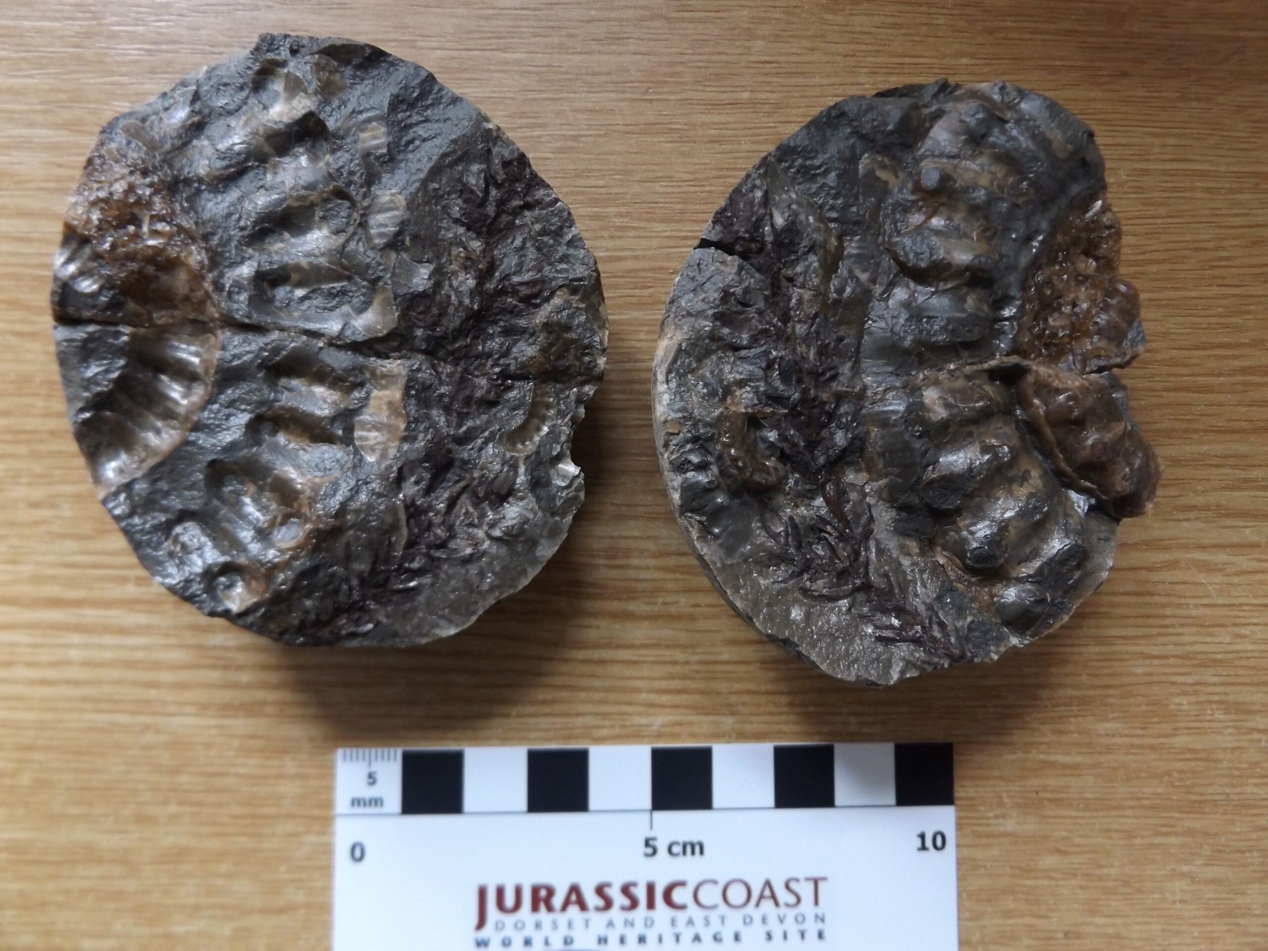 Part and counterpart preserved next to partial Microderoceras in a sea warn limestone nodule